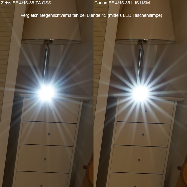 Gegenlichtvergleich Zeiss FE 4/16-35 ZA OSS und Canon EF 4/16-35 L IS USM bei Blende 13